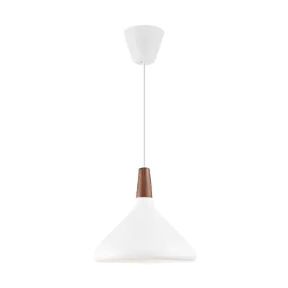 Die Nordlux Pendelleuchte aus der Modellreihe Nori zeichnet sich durch ein modernes Design und einen schicken Materialmix aus. Der Lampenschirm besteht aus Metall. Das Markenzeichen der Modellserie ist die Holzspitze in geöltem Nussbaum. Hinweis: Die Leuchte kommt ohne Leuchtmittel daher - passende E27 LED-Lampen finden Sie jedoch in unserem Shop.