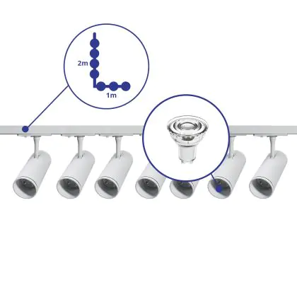 Beschreibung Komplettset 1-Phasen Rail L 1 x 2 Meter Weiß | incl. 7x Spot + GU10 2700K 3W Dimmbar + Abschlusskappe, Stromanschluss und L -Verbinder