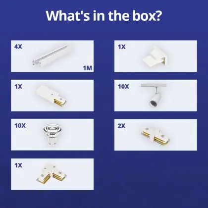 Beschreibung Komplettset 1-Phasen Rail L 2 x 2 Meter Weiß | incl. 10x Spot + GU10 2700K 3W Dimmbar + Abschlusskappe, Stromanschluss und L -Verbinder