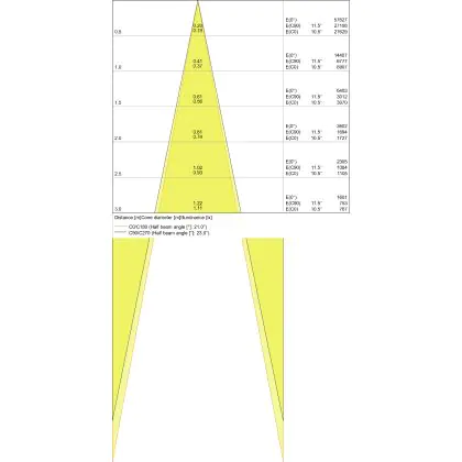 Beispiel: Wird eine Lampe mit einem Abstrahlwinkel von 60 Grad an der Decke (2,5 m Höhe) angebracht, erzeugt sie einen Lichtkegel von 2,9 Metern Durchmesser. Hat die Lampe hingegen einen Abstrahlwinkel von 120 Grad, beträgt der Lichtkegel 8,7 Meter im Durchmesser. |