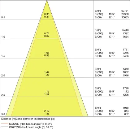 Beispiel: Wird eine Lampe mit einem Abstrahlwinkel von 60 Grad an der Decke (2,5 m Höhe) angebracht, erzeugt sie einen Lichtkegel von 2,9 Metern Durchmesser. Hat die Lampe hingegen einen Abstrahlwinkel von 120 Grad, beträgt der Lichtkegel 8,7 Meter im Durchmesser. |