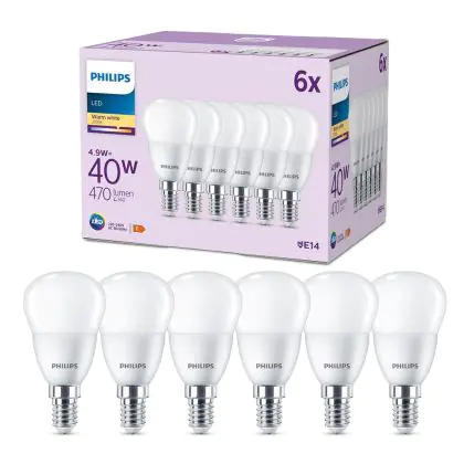 Die Mehrfachpackung 6x Philips Glühbirne LED E14 Birne Matt 5W 470lm - 827 Extra Warmweiß ist eine effiziente E14 LED-Lampe und der perfekte Ersatz für Ihre konventionellen W Lampen mit E14-Sockel. Zudem strahlt sie Licht in der Farbtemperatur 2700K - Extra Warmweiß aus und punktet durch eine lange Lebensdauer.