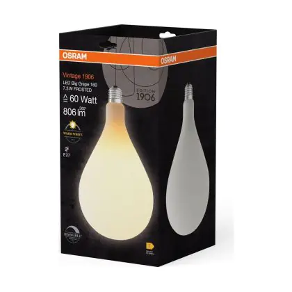 Die Osram Vintage 1906 LED Big Grape E27 Fadenlampe Matt 7.3W 806lm - 827 Extra Warmweiß | Dimmbar - Ersatz Für 60W ist eine effiziente E27 LED-Lampe mit Retrodesign und der perfekte Ersatz für Ihre konventionellen 60W Lampen mit E27. Zudem strahlt sie Licht in der Farbtemperatur 2700K - Extra Warmweiß aus und punktet durch eine lange Lebensdauer.