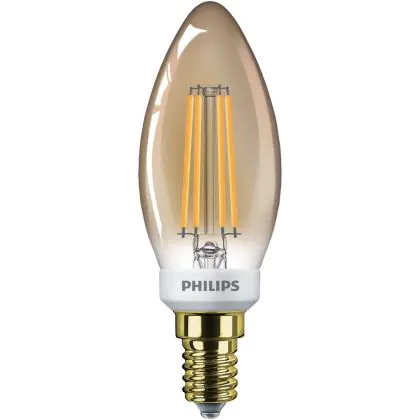 Die Philips Classic LEDcandle E14 B35 5W 822 Gold ist eine LED-Lampe, die besonders effizient im Verbrauch ist. Sie verfügt über eine lange Lebensdauer und strahlt Licht in der Farbtemperatur extra Warmweiß aus. Sie bietet Ersatz für herkömmliche Leuchtmittel mit einem E14-Sockel und spart bis zu 85 % an Energie ein. Darüber hinaus punktet sie durch ein ansprechendes Design und einem goldbeschichteten Leuchtkörper in Kerzenform.