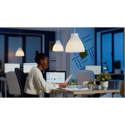 Die E27 LED-Lampe von Philips kann mit der Farbtemperatur 4000K - Kaltweiß sowohl als Akzent- als auch als Allgemeinbeleuchtung verwendet werden. Als Faustregel gilt: Je niedriger der Kelvinwert, desto gemütlicher wirkt das Licht.