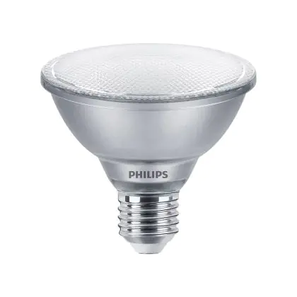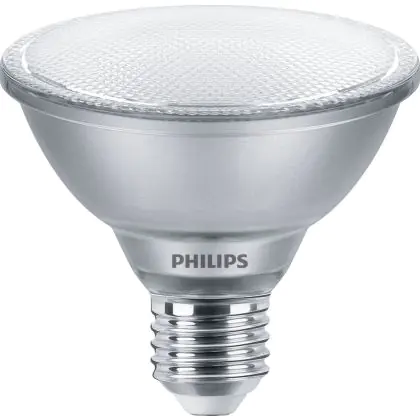 Der Philips Master Value LED Glühbirne Reflektor E27 PAR30S 9.5W 760lm 25D - 930 Warmweiß | Höchste Farbwiedergabe - Dimmbar - Ersatz Für 75W ist ein leistungsstarker LED-Strahler mit E27-Sockel. Er kommt mit einer hohen Lebensdauer von 25000 Stunden daher und spart Ihnen somit nicht nur Energie-, sondern auch Austausch- und Wartungskosten. Im Preis ist zudem eine All-In-Garantie von 5 Jahre enthalten.